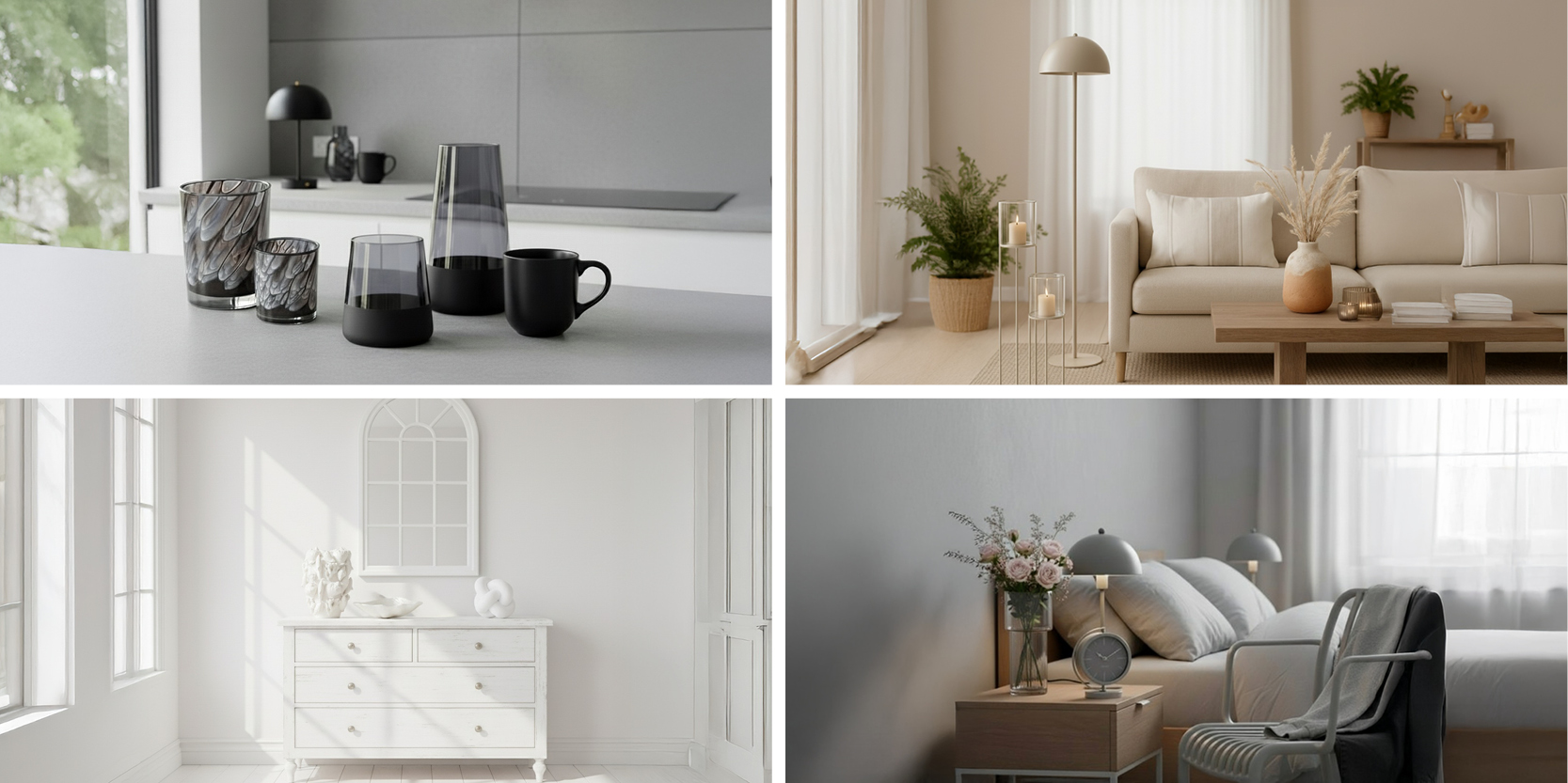 Ergänzen Sie Ihr Sortiment mit zeitlosen Klassikern in Weiß, Beige & Grau.